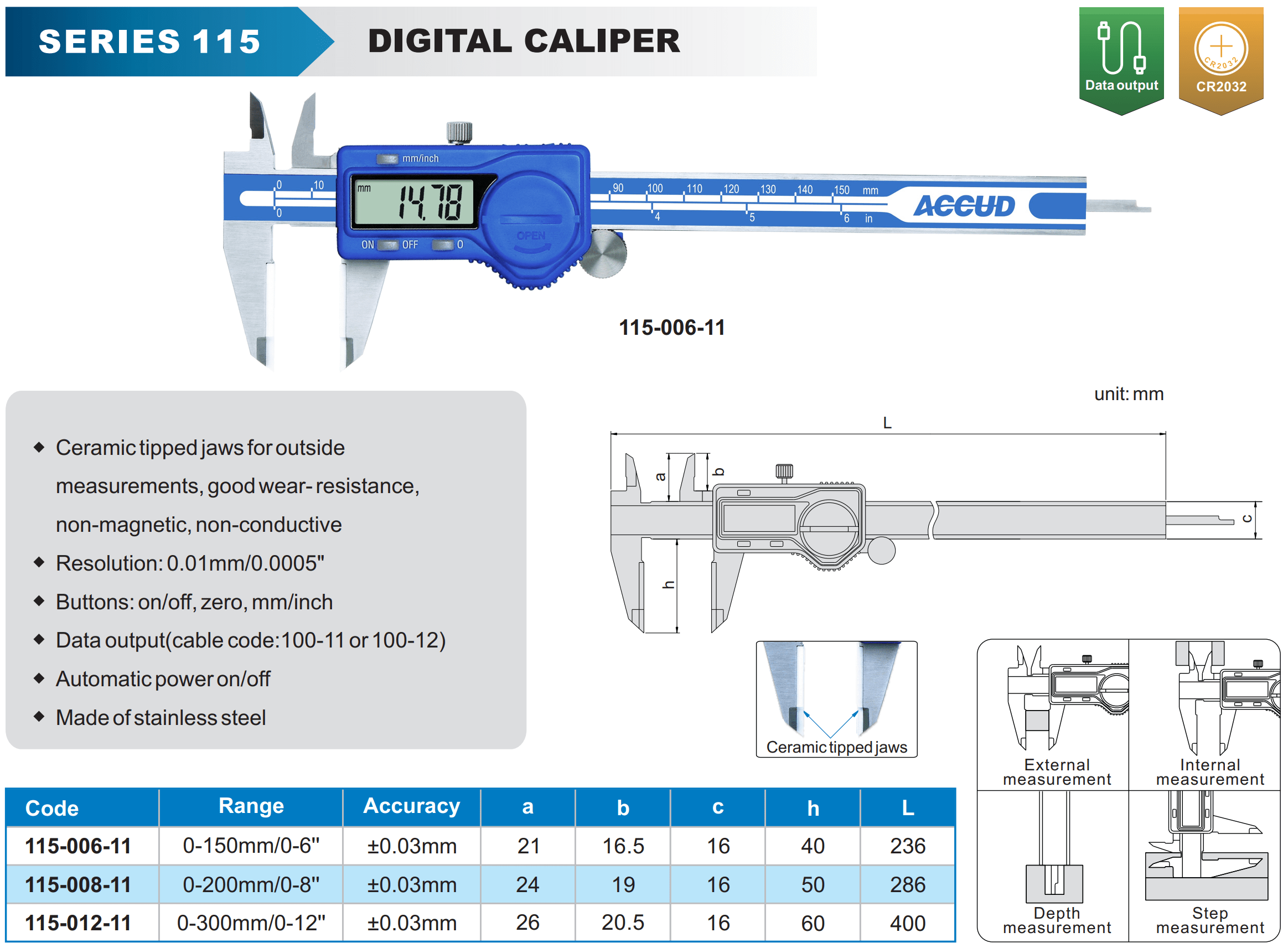 - Ceramic tipped jaws for outside measurements, good wear- resistance, non-magnetic, non-conductive
