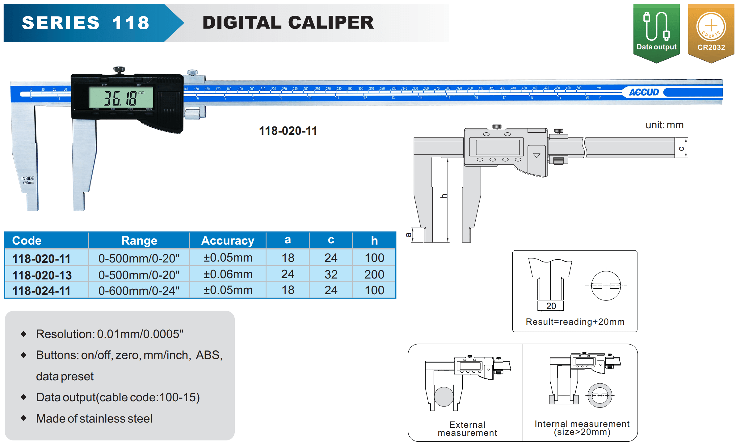 When using the caliper for inside measurements, add 20mm as engraved on the jaw end. See measurement explaind as 'w' in the specifications tab.