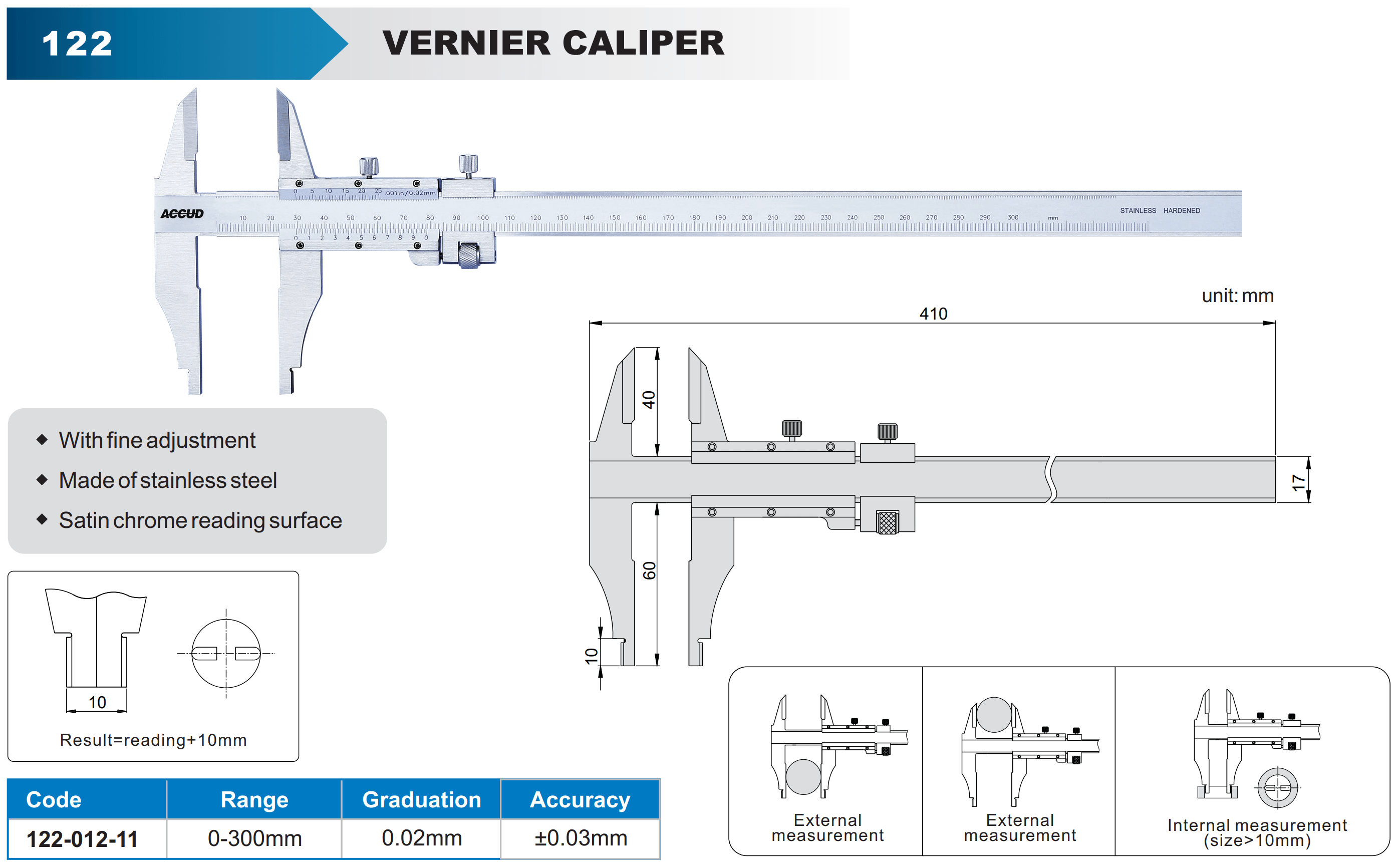 | Construction: | hardened stainless steel reading surface (scale, vernier) -chromed |