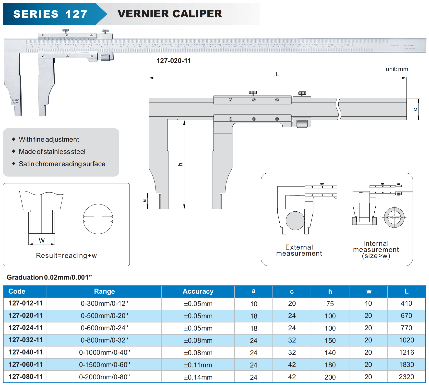 | Construction: | hardened stainless steel reading surface (scale, vernier) - stain chrome plated reading surface |