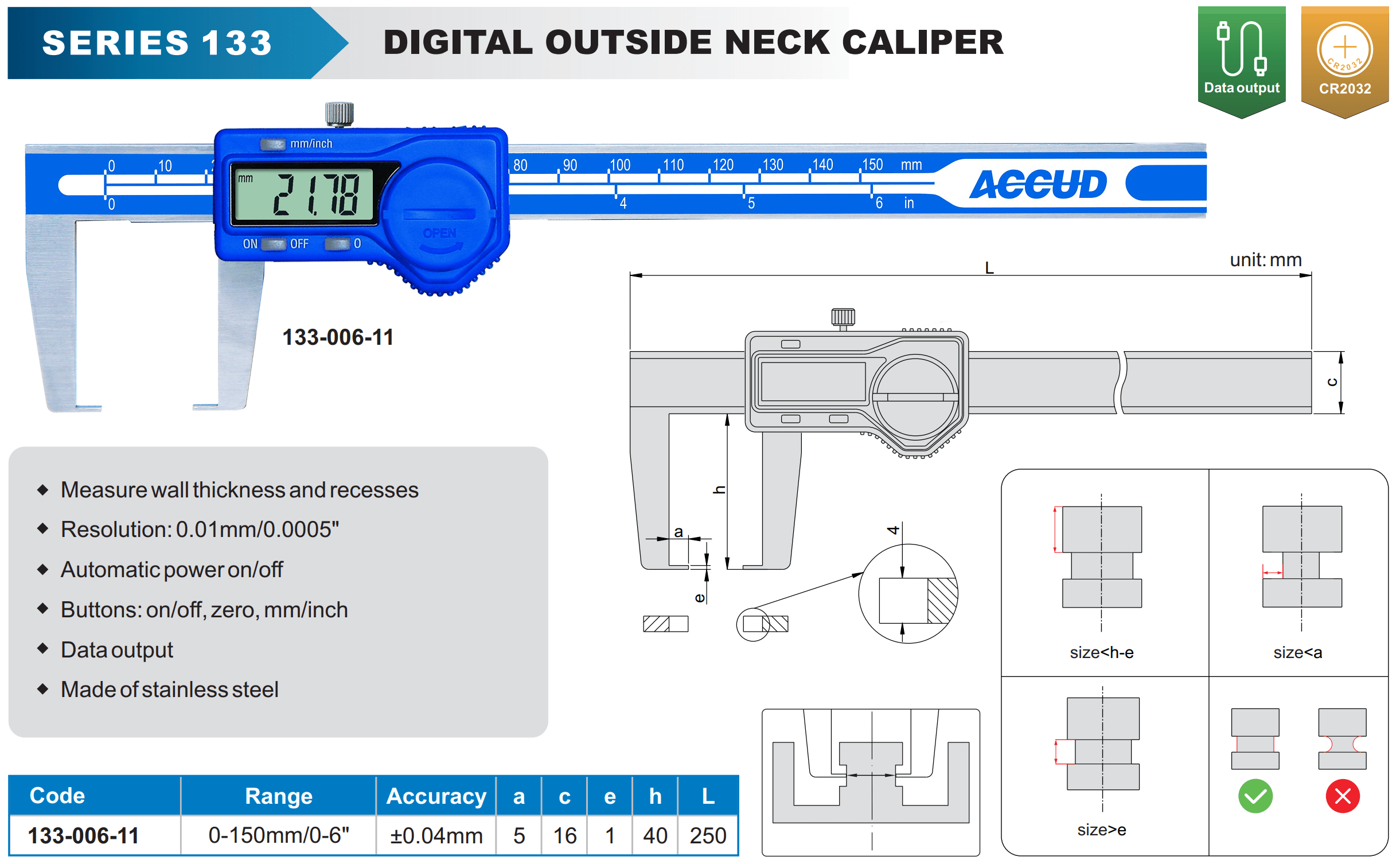 Workshop professional Digital Outside Neck Vernier Caliper with measuring range 0 - 150 mm and measuring resolution 0.01 mm. Designed to measure wall thickness, grooves and recesses.
