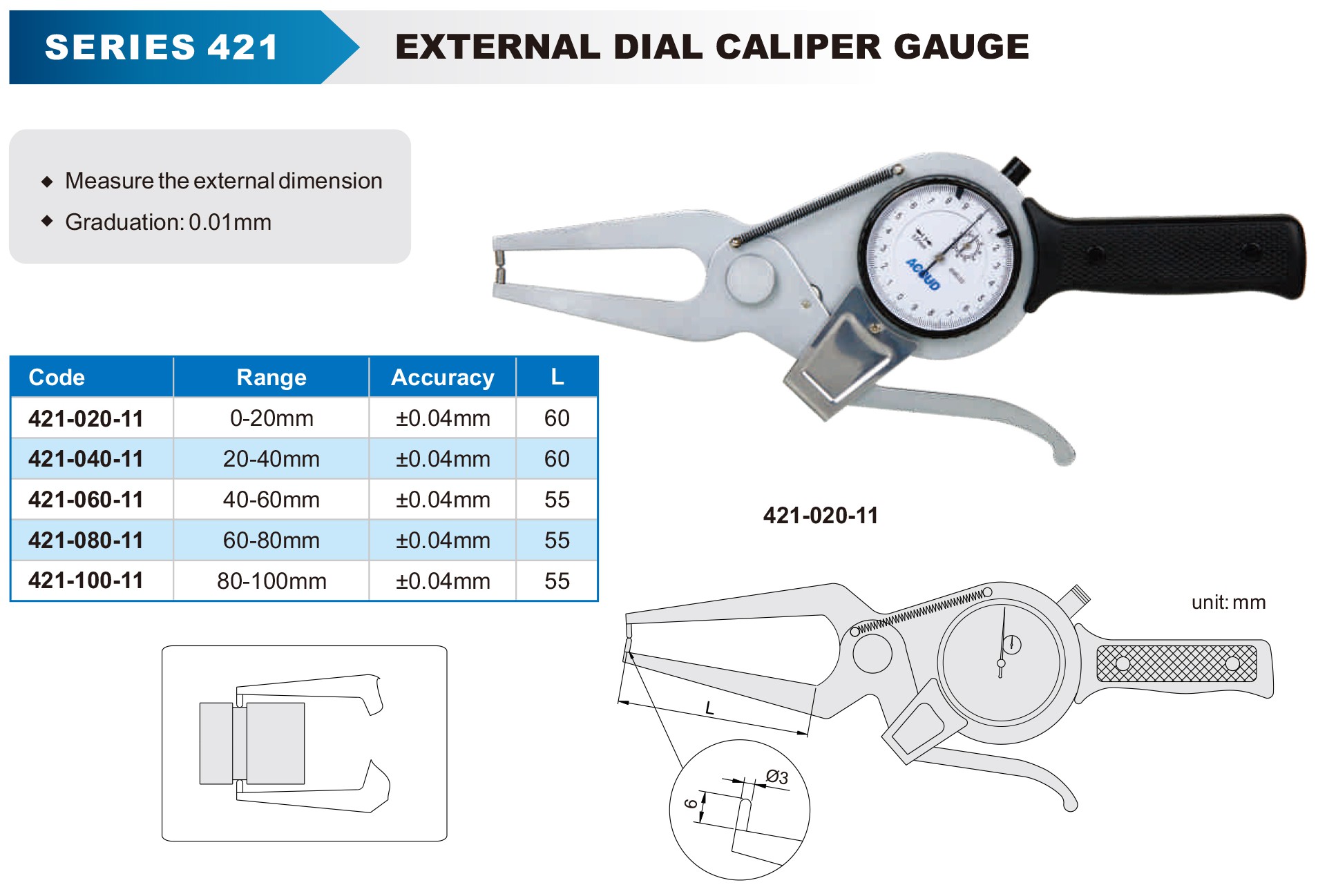 The Accud 421 Series internal dial indicators utilize spring-loaded jaws to make constant point contact pressure to take highly accurate comparison measurements of hole diameters and groove and tube thicknesses. The dial display provides precise, readable measurements in metric or inches. It is mostly used in conjunction with an optional setting ring for accuracy.