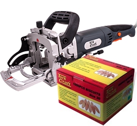 A biscuit joiner is a woodworking tool used to join two pieces of wood together. It uses a small circular saw blade to cut a crescent-shaped hole in the opposite edges of two pieces of wood or wood composite panels.