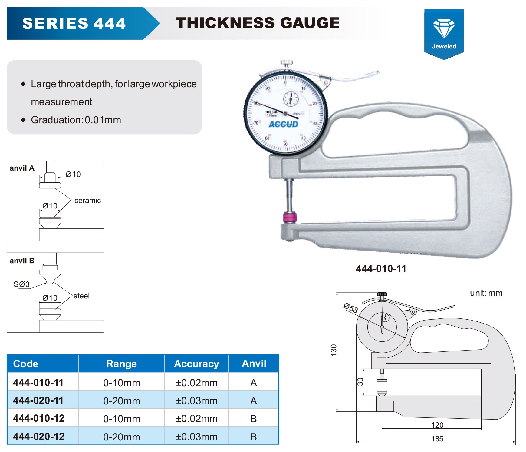 Thickness Gauge 20mm 0.03mm Acc. Large Depth Steel Anvil 0.01mm Grad.
