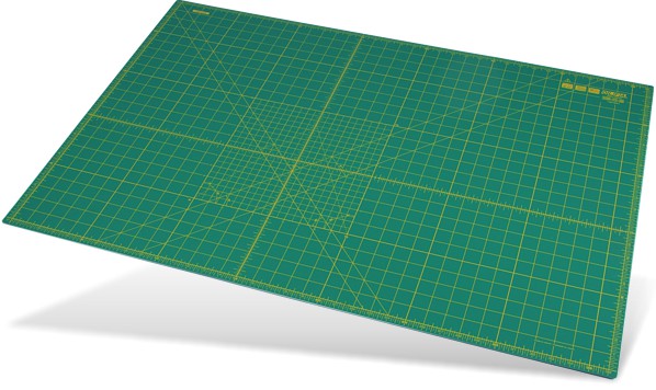 Self-healing, professional quality rotary mat. Basic dimensions: 940 x 630 mm (36' x 24'), 1.5mm thick. Double-sided use with a metric grid on one side and an inch grid on the flip side. The mat protects your work area and greatly extends the life of any OLFA rotary blade/cutter.