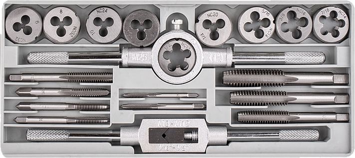 The TorkCraft 20 Piece carbon steel tap and die set, 9 taps and 9 dies included