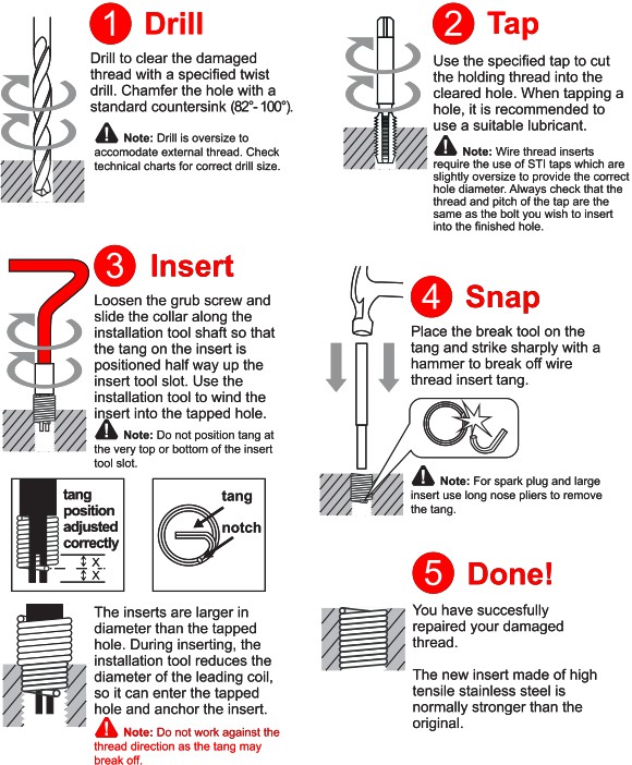 - Different kits available to repair threads from M4 to M12