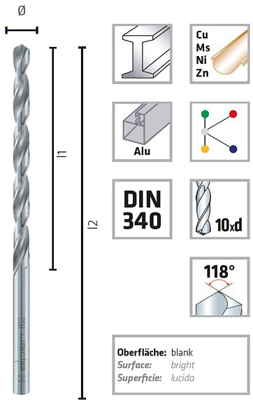 HSS twist drill ground from solid, bright finish: toughness and precision combined with excellent cutting effciency for drilling alloyed carbon and plain steel.