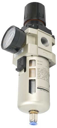 A regulator is combined with the filter to increase or decrease the pressure. A pressure gauge indicates the set pressure.