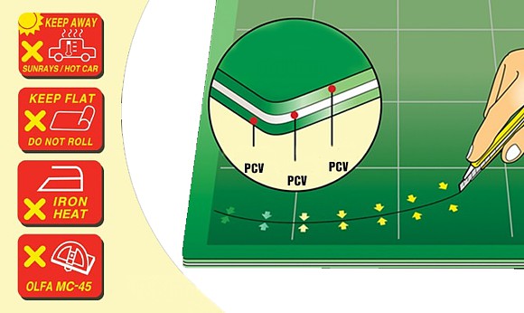 Self-healing, an OLFA original technology refers to the ability of the surface to return to its original shape after being cut and are ideal for general quilt cutting. A three-layer structure ans soft cutting surface realize smooth cutting even after many years use.