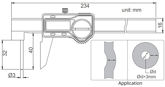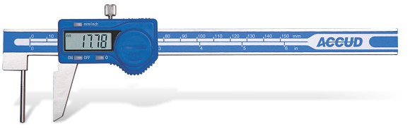 Workshop professional digital tube wall thickness caliper with measuring range 0 mm - 150 mm and measuring resolution 0.01mm. The jaws are 32 mm long. Designed to measure the thickness of tube walls.
