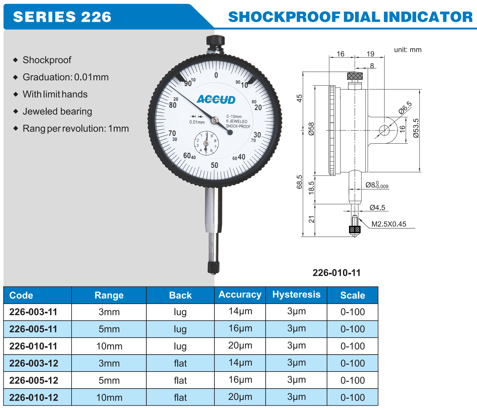 Shock-proof dial indicators are widely used in manufacturing, machining, quality control, and inspection processes. They are particularly useful for checking the flatness, roundness, and alignment of parts, as well as for measuring runout, deflection, and thickness. The shock-proof design makes them ideal for environments where the instrument might be exposed to rough handling or vibrations.