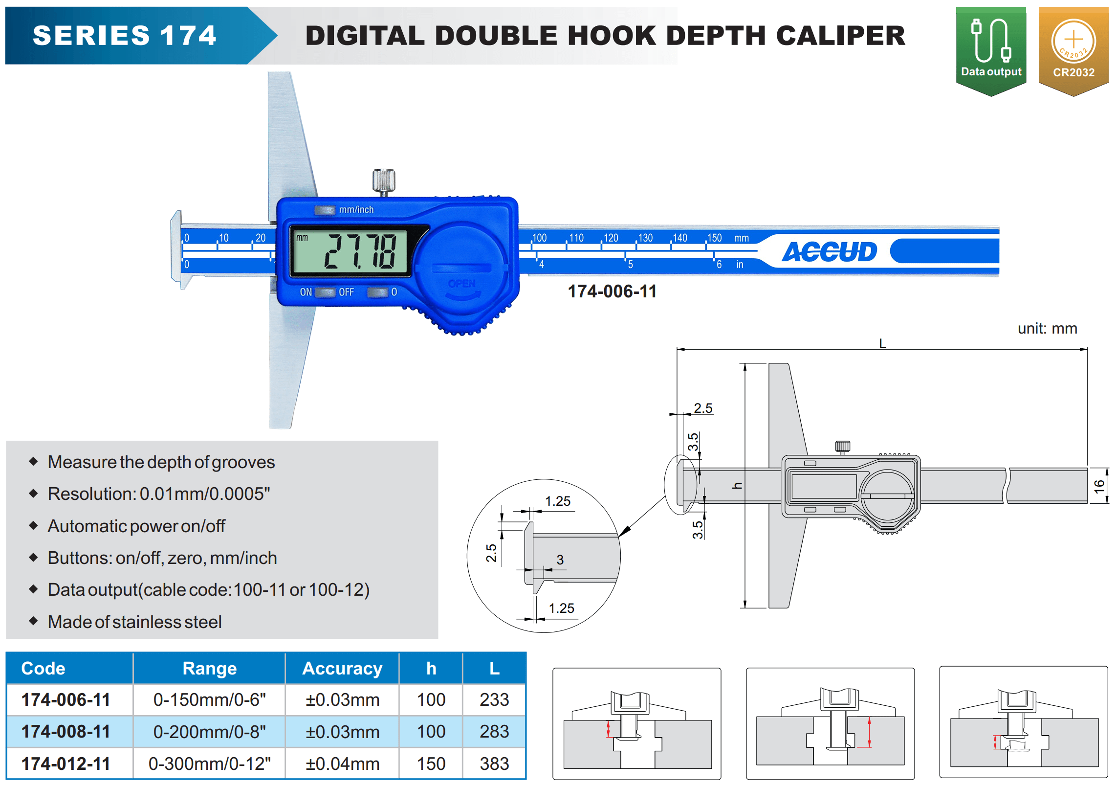 - The depth gauge allows measuring in hard-to-reach places and grooves