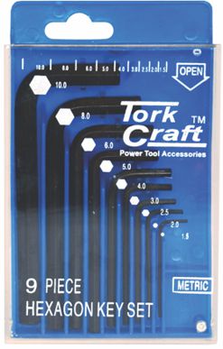 The TorkCraft Hex Key set is made of high quality CrV steel, heat treated for high toughness and torque. Standard hex tip on one arm and comes witha plastic case for storage