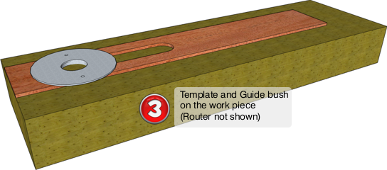 Step 3 shows how the guide bush and the template will fit onto the workpiece. The router is not shown for clarity. |