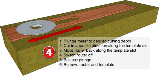 Step 4 is not a difficult as it may seem. Just think carefully before start cutting the slot. The depth setup of the router bit through the guide bush is important. The slot part of the keyhole cutter should protrude enough to allow for the thickness of the template. (Try first on a scrap piece of wood). Remember the workpiece should hang, thus the large hole of the keyhole should be at the bottom. Once you are satisfied with the final depth of cut of the router and the depth gauge on the router is set, mount the router with guide bush into the template starting at the bottom of the desire keyhole slot you want to cut.