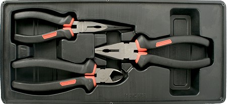 Insert for tool our tool cabinets. 1/3 drawer size, 3 piece. The set includes combination, long nose and side cutting pliers. High quality chrome vanadium steel and non-slip non-slip coated grips guarantee high quality and comfort of work.