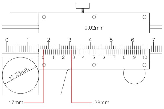 - The decimal is determined by the alignment of the markings on the vernier scale to the main scale. The first alignment from left to right will be the decimal reading accurate to 0.02mm.