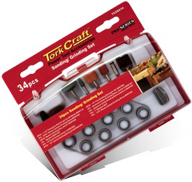 The set includes a total of 34 sanding and grinding mini tools that can be used with any Tork Craft rotary mini tools.