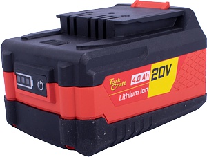 The battery pack fits all 20V Tork Craft Power Tools, is lightweight Lithium-Ion, and has a 4.0 Ah electric charge.