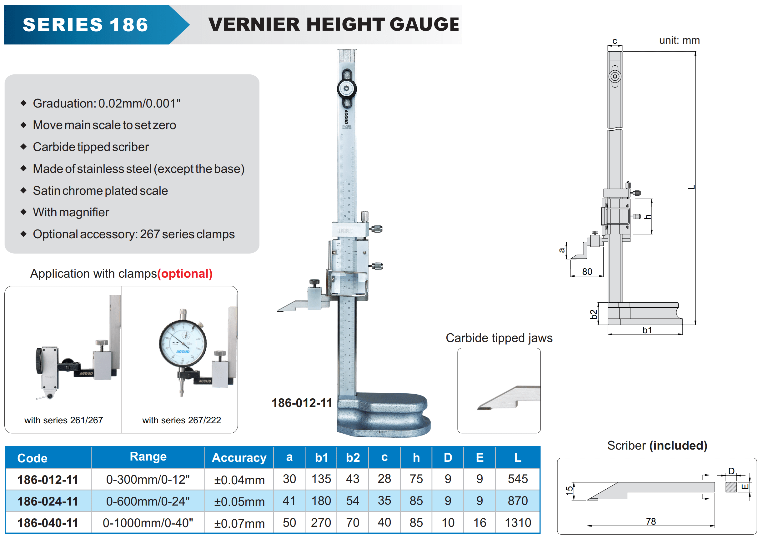 Manual Vernier Height Gauge by ACCUD with a measurement range 0-300mm / 12 inch and a graduation of 0.02 mm