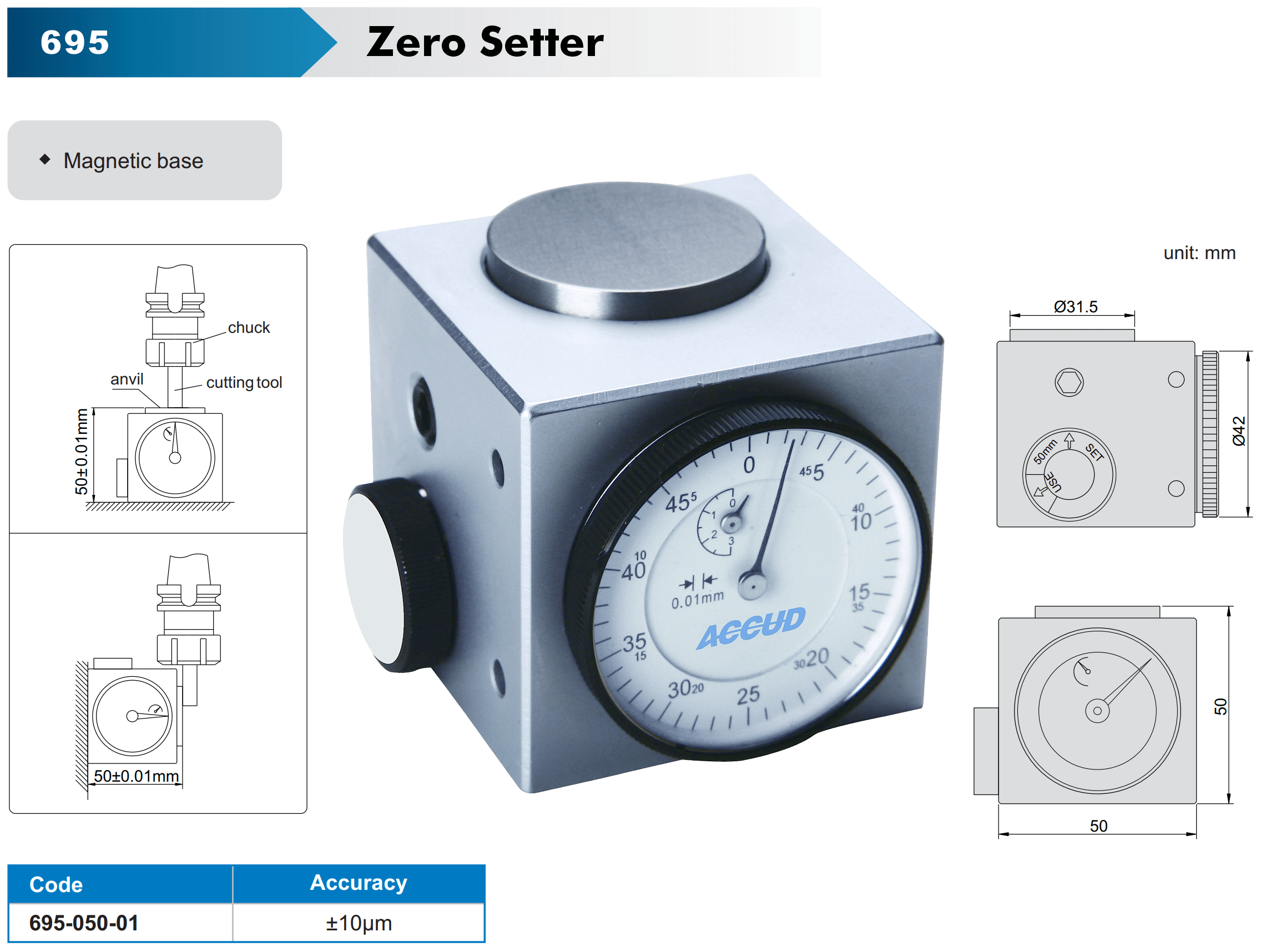 - Magnetic Base: The tool is equipped with a magnetic base, allowing it to be securely attached to the machine table or other ferrous surfaces. This base stabilizes the zero setter during use, ensuring accurate and consistent measurements.