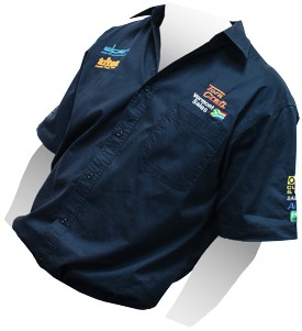 The shirt represents the Vermont Sales company. The leading brands are embroidered on the sleeves and the chest.